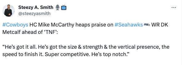 Metcalf has only four 100-yard games in the last three regular seasons combined. He did have 110 yards and a touchdown the last time he played the Cowboys, but that was in 2020. The Seahawks need somebody to step up if they have any shot against the Cowboys, so putting that on the player who makes the most money would be a good place to start.