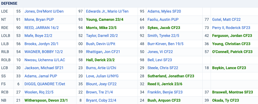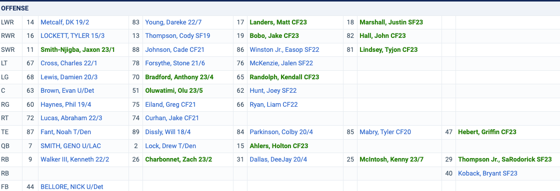 The “bubble” here seems to be hovering around WR Cade Johnson, WR Cody Thompson, WR Jake Bobo, OL Greg Eiland, TE Tyler Mabry (longshot probably), RB SaRodorick Thompson (probably cut actually), DL Jacob Sykes, LB Vi Jones, LB Patrick O’Connell, LB Jon Rhattigan, OLB Tyreke Smith (I think he is trending up probably?), OLB Levi Bell, CB Artie Burns (CB depth will be important), DB Jonathan Sutherland, DB Jerrick Reed II, S Joey Blount.