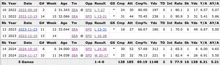 I’m not piling onto Smith to cite him as an example: It’s just as important to add the context that Smith’s worst game of the year would also not be fairly representative of who he was as a quarterback for that entire season. Smith always plays poorly against the 49ers; nearly all of his games as a Seahawk with less than 6 adjusted yards per attempt have come against San Francisco: