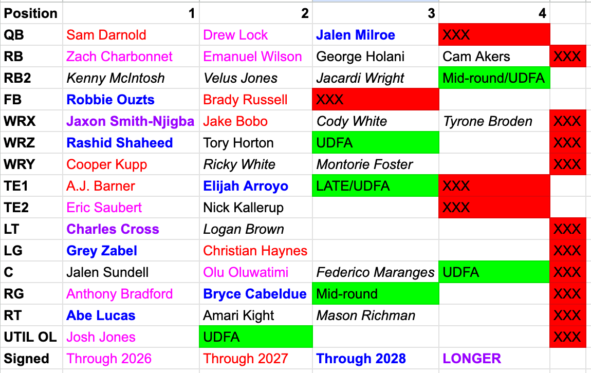 Let’s review Seattle’s offensive depth chart, including players who are locked in for next season, those who are under contract for the longest amount of time, and when does it make sense to invest a draft pick or an undrafted free agent contract into filling out this depth chart.