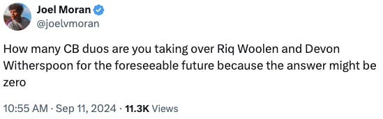 Going into the 2024 season, no other team in the NFC can come close to matching who Seattle has at the cornerback position…and few have even tried. Last season’s NFC Pro Bowl corners were Spoon, DaRon Bland, Jaylon Johnson, Charvarius Ward, and Darius Slay. I wouldn’t be surprised if Witherspoon is soon considered the best CB in the NFC overall and that Riq Woolen is in the top-5, putting both in the Pro Bowl, if not the All-Pro lists.