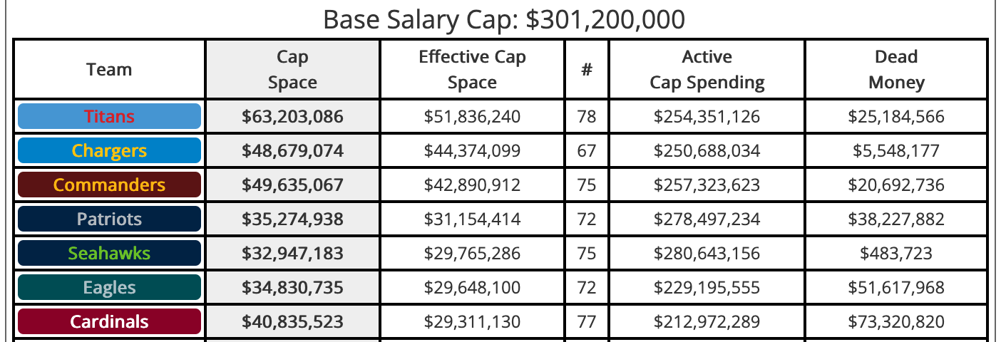 With the lowest amount of dead cap space in the league and barely $3 million needed to commit to the rookie class (trading their first pick would basically eliminate the need to pay a rookie class on the salary cap), Seattle has $29.7 million in effective cap space. If they trade the first round pick, that would be over $31 million in cap space, the fourth-most in the league.