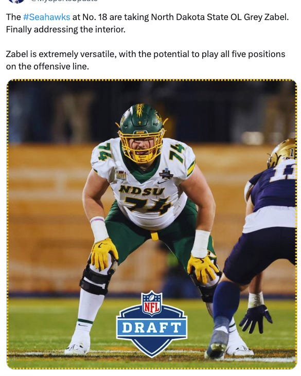 With the 18th pick in the 2025 NFL Draft, the Seattle Seahawks took North Dakota State offensive lineman Grey Zabel. The most obvious and common move was actually the one that happened!