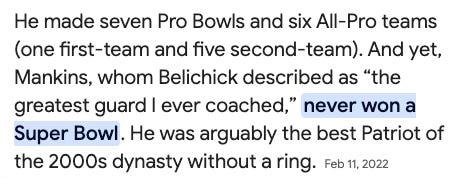 As you can imagine, there are different ways to answer that question. Did the player get drafted as a tackle and move to guard? Did that player win a Super Bowl with a different team? Did that team win a Super Bowl, but without that player starting or even in spite of that player?