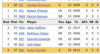 Williams played tackle in college and he’s only ever played tackle in the NFL, but there was a lot of thought at the time that he’d move to guard so in a way he’s kind of a guard pick. Obviously the Bengals figured they were getting a tackle, but didn’t know he’d end up being a mediocre one.