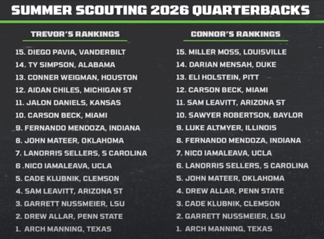 The NFL Stock Exchange podcast shared two top-15 QB rankings for the 2026 class and Manning was the ONLY quarterback to have the same poll position on both lists: