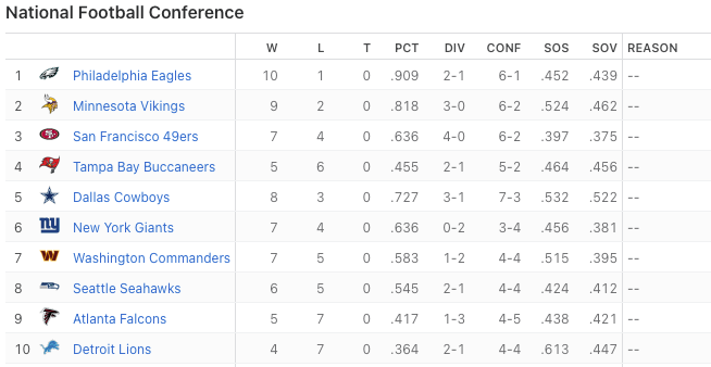 Tampa Bay drops to 5-6 but stays in first place in the NFC South. I said this to a friend yesterday, which is that the NFL would love nothing more than Tom Brady vs. Patrick Mahomes in the Super Bowl again. I cautioned people against believing NFL conspiracies in my post yesterday, but secretive planning or not, Roger Goodell wants Brady in the Super Bowl over Geno Smith, Kirk Cousins, and even Jalen Hurts.