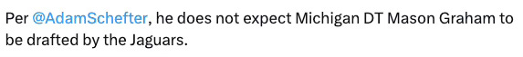 In the last 24 hours, Mason Graham has gone from the media’s “lock” to the Jaguars at 5 to losing his strangehold as a consensus top-10 pick. It does not mean that Graham won’t go top-10, and he could still go to the Jaguars, but there is no longer a perception that he’s completely off limits to teams picking after Jacksonville.