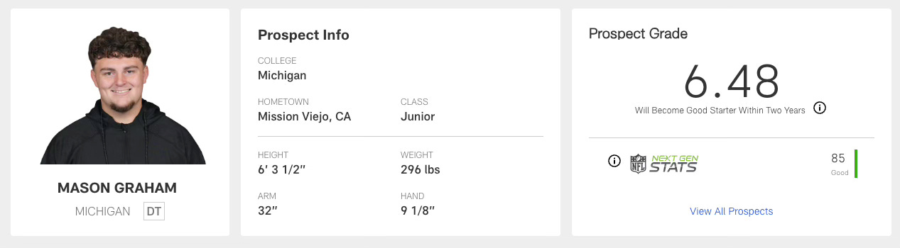 His PFF pass-rush grade on true pass sets, PFF run-defense grade, pass-rush win rate and solo run-stop rate over the past two years at Michigan are all above the 95th percentile. He has adequate size to play 3-technique in the NFL, but he played at just about every alignment on the defensive front over the past two years. Graham is explosive in his first step, giving him good speed-to-power conversion and effective push-pull moves. He shows good bend, and his hands are fast, violent and well placed, especially in run defense. He likes to use a two-hand swipe or a club-arm over as his main pass-rush moves. His biggest issues stem from a lack of arm length, but there is still so much to like. His competitive toughness and motor are ideal.