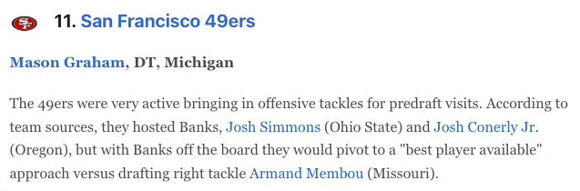 Going a step further, Miller does not even have Graham as the first defensive tackle off of the board as he has the Panthers taking Walter Nolen. Yeah, it’s “lying season” and so on…and this is just a theory.