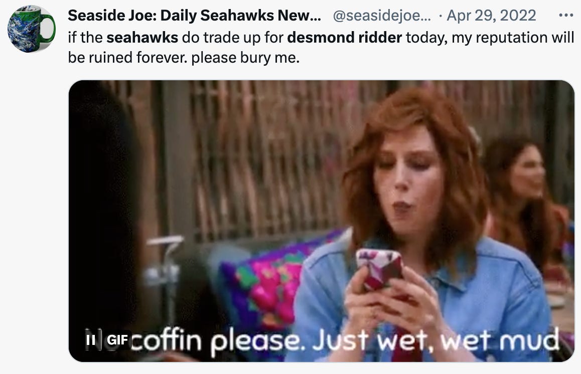 No doubt. The Seahawks are going to trade up from 40 into the first round because they were worried they’d lose their chance at Ridder. In fact, Seattle passed on Ridder at 40, 41, and 72.