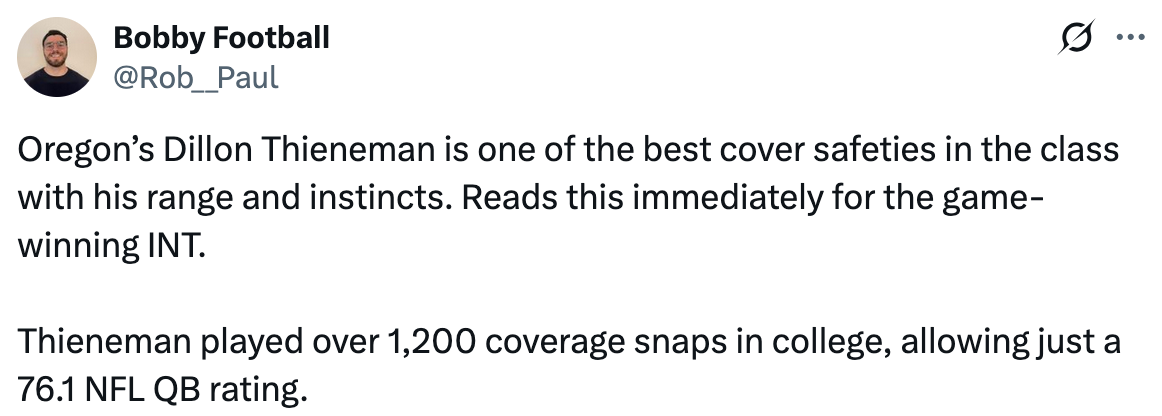 There’s really no good consensus on where any of the other top safeties will go in the draft besides Downs. Thieneman is second on some lists but fifth on others. We could get to April and see that he’s a first round pick. Or a third.