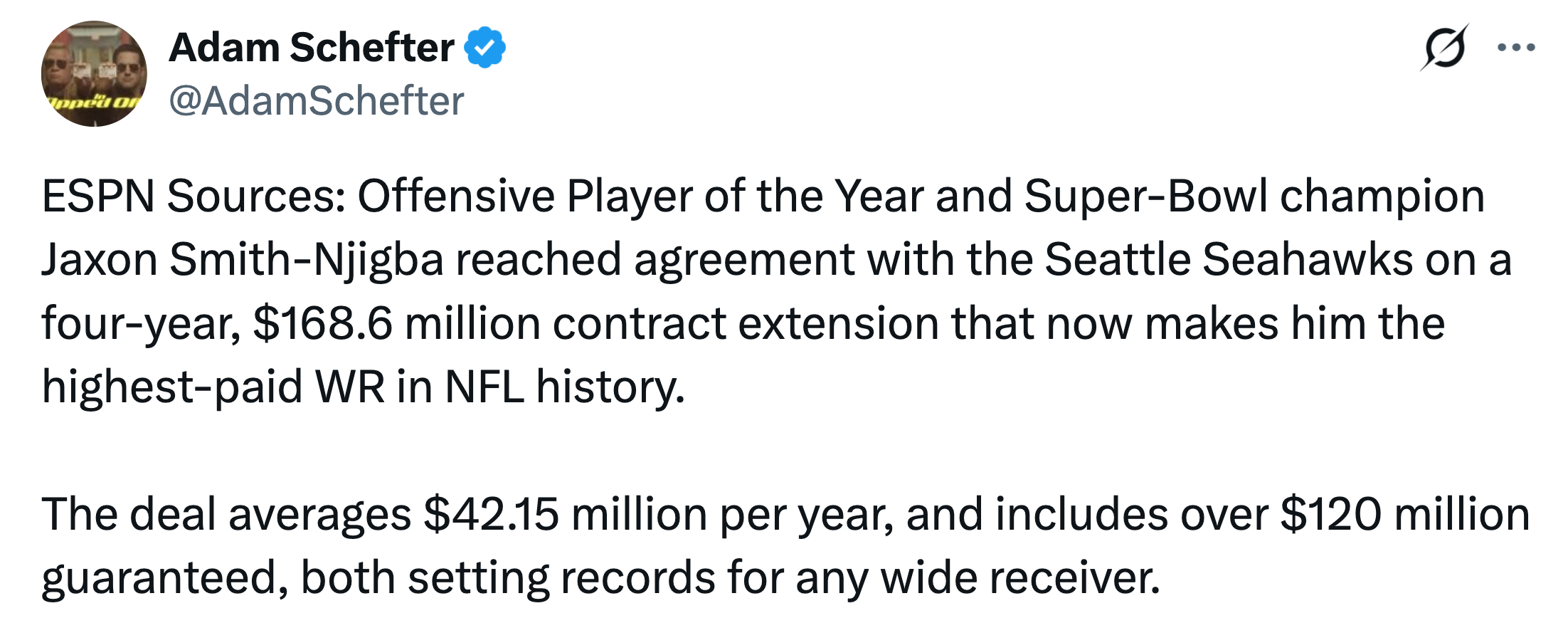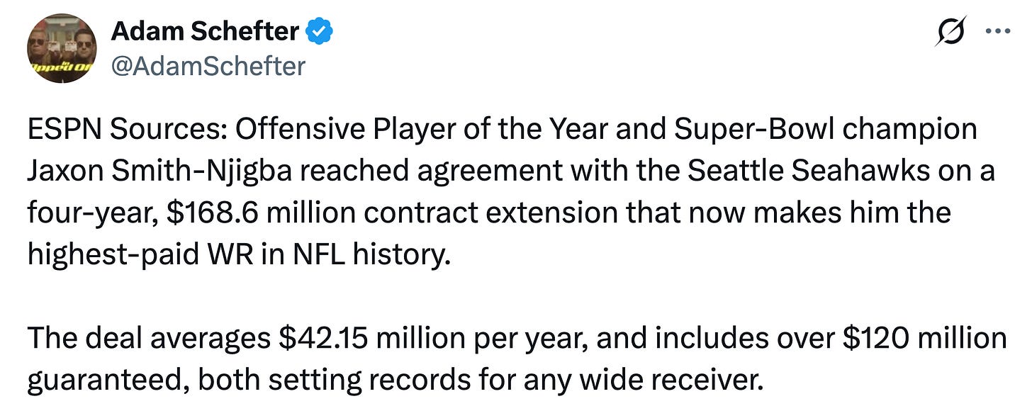 On Saturday, I wrote that I expect the Seahawks to work quickly on a contract extension for Jaxon Smith-Njigba and projected a four-year, $164 million deal. On Monday, the Seahawks announced that they have signed JSN to a contract extension worth $168 million over four years.
