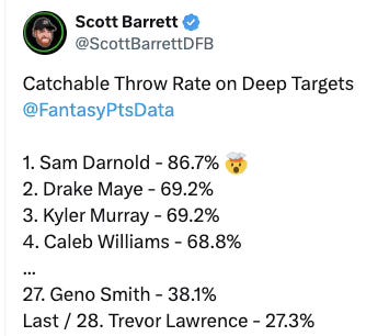 Gavin: I was a huge Milroe believer in the offseason but I agree…Darnold has raised expectations beyond what we could’ve hoped for when we signed him; he’s young enough to fully build this team around him.