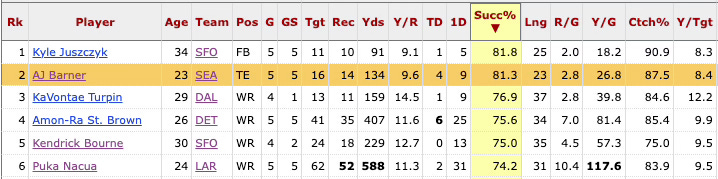 A.J. Barner and Dallas Goedert are the only tight ends with at least four touchdowns this season. In fact, their numbers are basically identical: Barner has 14 catches for 134 yards, which is one fewer catch and one more yard than Goedert. Barner’s 81.3% success rate* is the second-highest in the NFL behind fullback Kyle Juszczyk!