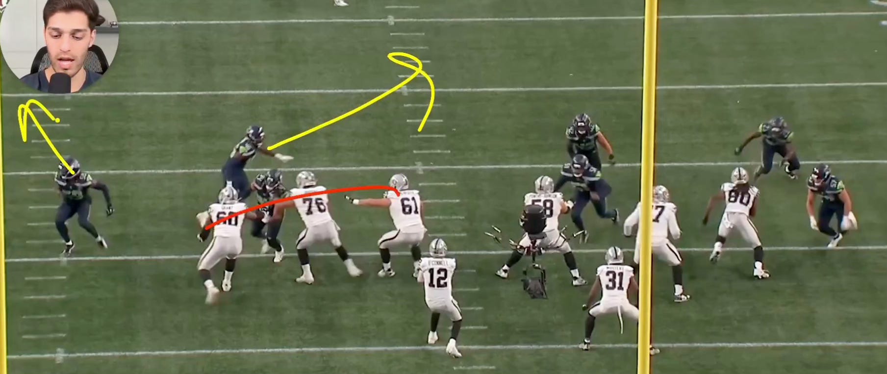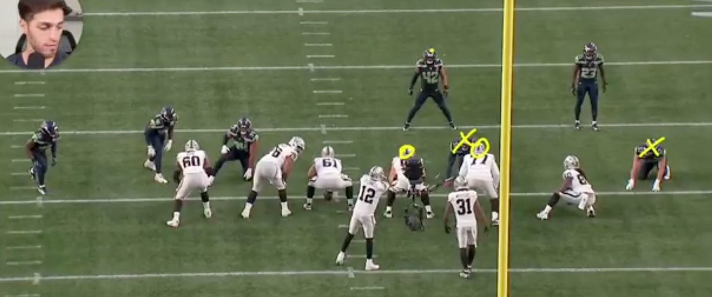 To give you some perspective on the opponent, O’Connell is maybe at-best a modern day Tarvaris Jackson, but everything we see happen in this play (and during a dominant defensive first half) should resemble what Seahawks fans will see in the regular season against most starting quarterbacks. Macdonald knows how to mess up your pass protection, now he just needs to figure out how to create his own.