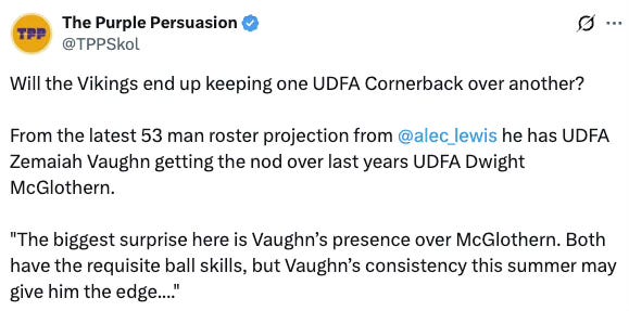 Undrafted in 2024, McGlothern started as a four-star prospect at LSU and he flashed a 4.47 40-yard dash at 6’1 and a half, 185 lbs at the combine. He also had a 1.5 10-yard split. Should Minnesota choose the newest UDFA over the previous UDFA, the Seahawks could take a flier on McGlothern; coincidentally he was teammates with Griffin on the Vikings last year.