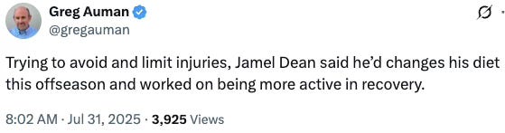 If the Seahawks are underwhelmed by what they’ve seen from Shaquill Griffin, a player who has already missed a lot of camp thus far, a veteran with outside corner experience could become a major need. By most accounts, Dean has not played very good recently but maybe Macdonald could get more out of him than Todd Bowles if he becomes expendable there. Tampa spent two day two picks on cornerbacks, opening the door for change.