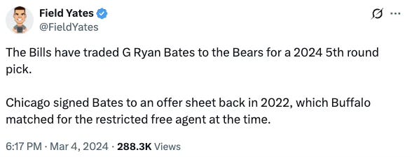 John “guards are overdrafted and overpaid” Schneider could even make the pitch to GM Ryan Poles that the two teams should swap guards, sending the more project-y Haynes to Chicago in exchange for a more Sunday-ready utility backup in Bates. Unless we see him with the starters this week against the Chiefs, which is unlikely, Haynes has probably lost that job and if he’s lost that job to Anthony Bradford then can he be trusted to be the backup to Bradford?
