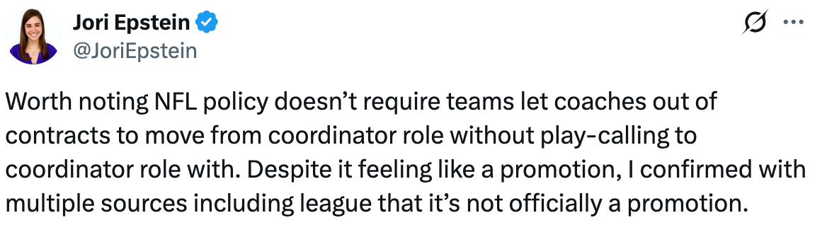 -Going from a non-play calling OC to a play calling OC is NOT recognized by the NFL as a promotion, so teams can block those requests