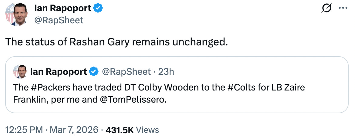 We already know that Gary posted, then deleted, a goodbye post on Instagram. He’s still on the Packers for now.
