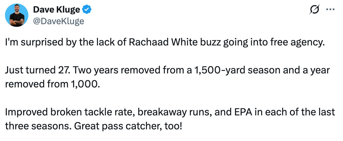 As free agents go, would the Seahawks look at someone like Rachaad White, a running back praised for blocking and receiving?