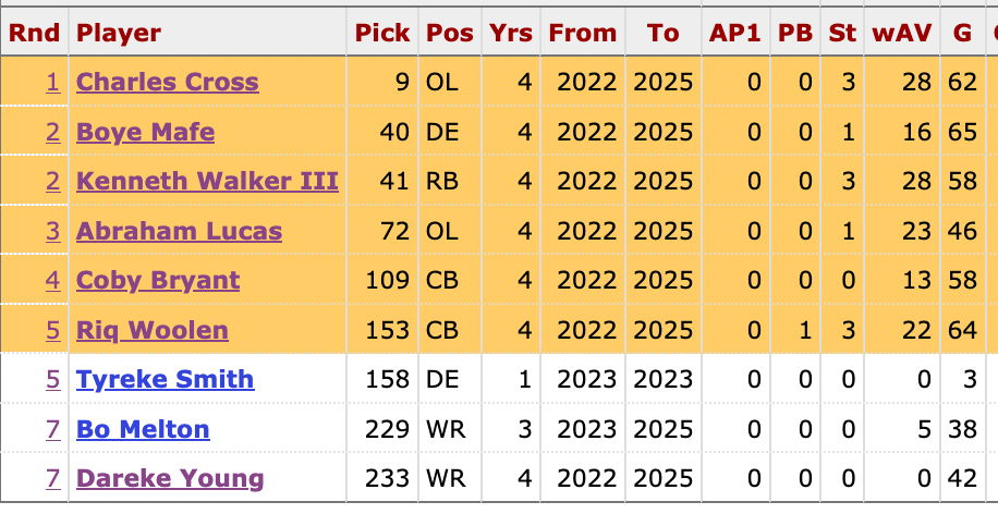 Seattle’s 2022 draft class goes down as one of the best of all-time even if the Seahawks didn’t keep all of those players: Cross and Lucas signed for a combined $150 million in new money, Walker got $45 million, Mafe got $60 million, and Bryant got $40 million. That’s ONE team’s class in ONE year that has already made $295 million in extension money and that’s before Riq Woolen signs.
