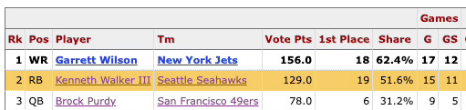 Do you know who got the most first place votes for the 2022 Offensive Rookie of the Year award? It wasn’t winner Garrett Wilson. It was runner-up Kenneth Walker III.