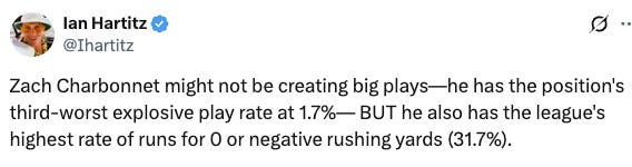 Through six weeks, Walker ranks 18th in rushing yards per game (60.7), 17th in yards per carry (4.7), 22nd in first down runs (17), and 34th in success rate (46.2%). Just compare Walker to 7th round rookie Jacory Croskey-Merritt: