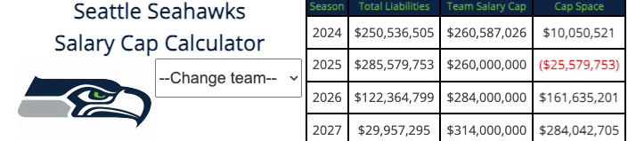 I actually use OvertheCap, not Spotrac, 98% of the time. That’s also where I’m getting this screenshot, but the numbers are going to be basically the same at either website. When you see this red -$25.6 million in 2025, that’s obviously going to be concerning to Seahawks fans: