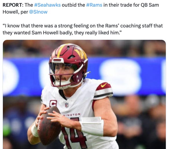 In the same way that trading for Drew Lock represented for Schneider an opportunity to get a QB project who is probably better than 95% of prospects in that draft class, Howell is a QB project who is probably as good or better than 90% of the prospects in 2024. When you eliminate the QBs who the Seahawks have zero chance of selecting—Caleb Williams, Jayden Daniels, Drake Maye, and possibly J.J. McCarthy, if not more than four—then Howell has maybe as much upside and “comfiness” as any 2024 rookie.