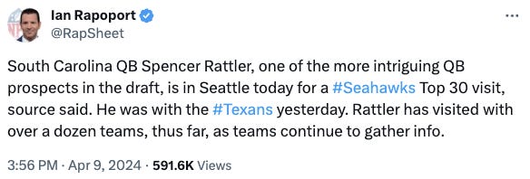 And I don’t believe that interest in Daniels, Maye, and McCarthy is necessarily ‘due diligence’ either; my McCarthy skepticism set aside for now, the Seahawks may be expecting one of the non-Caleb top-four players to fall within striking distance of a trade. If the Seahawks get an opportunity to acquire a quarterback who Schneider feels could be the next Josh Allen or Patrick Mahomes, he will take it. Something I wrote about before last year’s draft too.