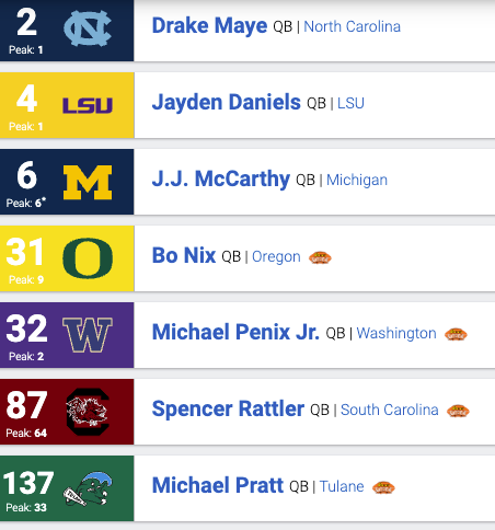 Not only have the Seahawks had some contact, even if minor, with Drake Maye, Jayden Daniels, and J.J. McCarthy, they obviously have a strong connection to Penix, have met with Nix, and are now linked to Rattler. Including Michael Pratt, another reported pre-draft meeting, that’s essentially the top-SEVEN quarterbacks in the 2024 class behind Caleb Williams. This is from the NFLMockDraftDatabase QB big board: