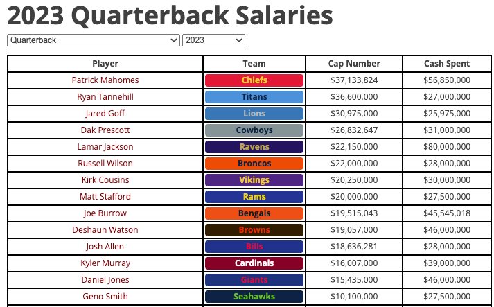 Going back to their 2023 salary cap hits, we know that Mahomes (#1 in salary cap) has directly caused the Chiefs to lose players who helped them win the Super Bowl and now Kansas City is essentially being rescued by the fact that they play in a division with the Broncos, Raiders, and Chargers. I don’t know if Mahomes can rescue the Chiefs in the playoffs again.