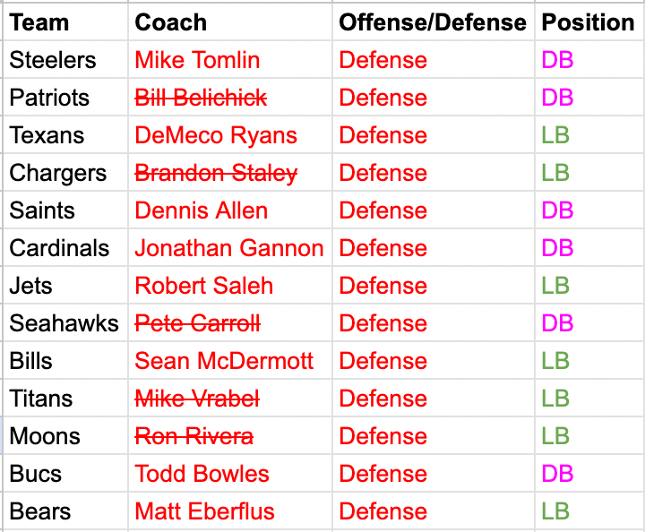 5 of the 14 were fired (Pete, Rivera, Vrabel, Staley, Belichick) and 3 of those coaches had been linebacker coaches. Now that the Patriots have hired Jerod Mayo and the Raiders have hired Antonio Pierce, that brings in two more former linebackers among the fraternity of head coaches.