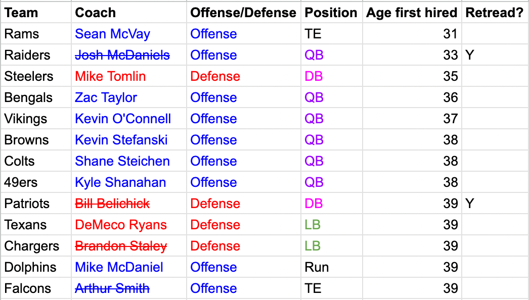 To make that more clear: Not all of these head coaches were under-39 last season, but they got their FIRST head coaching job when they were 38 or younger. So, for example, Josh McDaniels was hired by the Broncos when he was only 33.