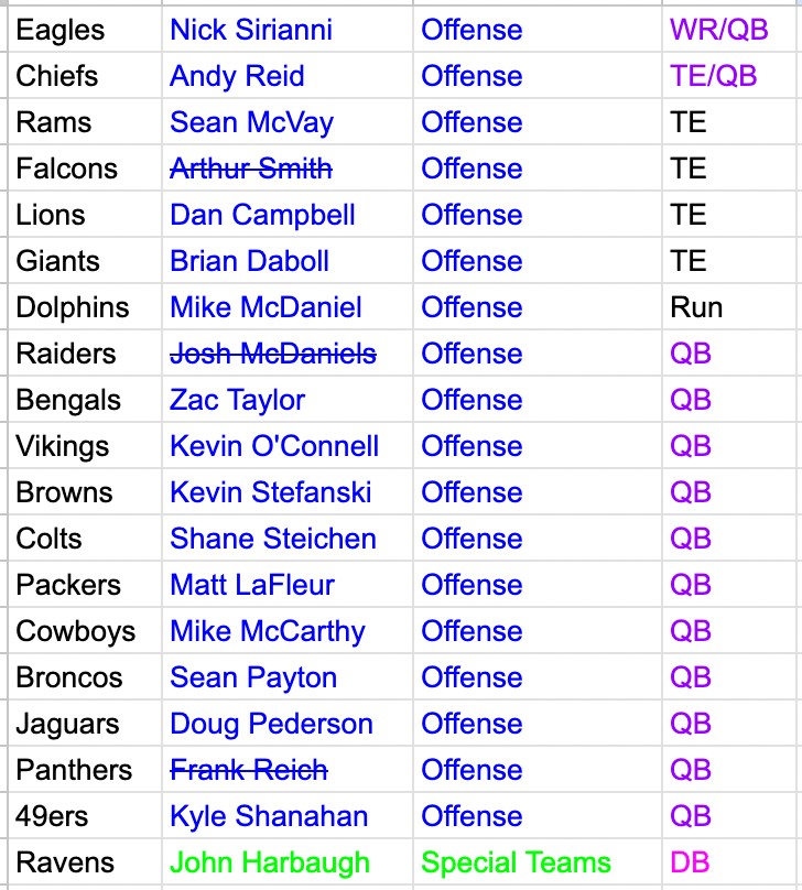 40% of 2023 head coaches previously coached, and sometimes played, the quarterback position. Of those 13, two were fired (McDaniels, Reich), but we could see at least two more added in the next hiring cycle. Examples include Jim Harbaugh, Brian Callahan, Dave Canales, Todd Monken, Mike Kafka, and Kellen Moore.