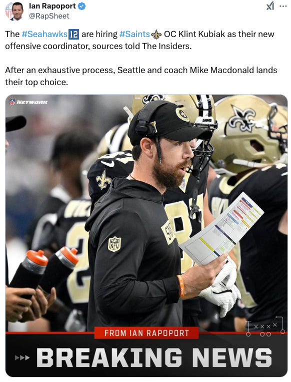 The Seahawks hired Klint Kubiak as their next offensive coordinator. Please forgive me for writing an article about Seattle’s difficult OC search as this news broke!