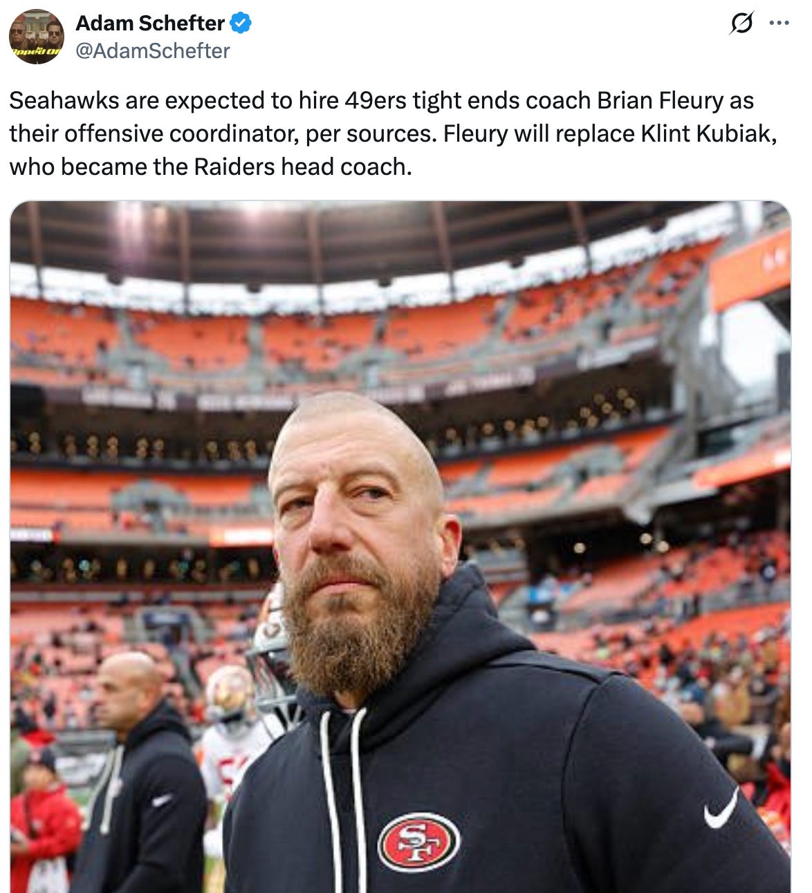 The obvious upside to the move is the interchangeability of the Shanahan and Kubiak offenses, as well as the intel of picking a coach from the 49ers who not only has some insight into one of Seattle’s division rivals but has also been part of a successful franchise run. Fleury’s tight end experience with George Kittle could come in handy with A.J. Barner and Elijah Arroyo.