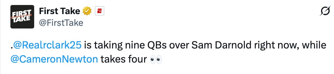 That might feed you for a day. If you’re lucky. But as anyone who watched ESPN today can attest to by Ryan Clark arguing that Darnold isn’t one of the top-10 quarterbacks in THE NFC (just the NFC, not the entire NFL), if time heals no wounds, then Super Bowls improve no grades.