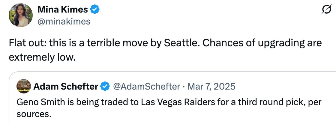 Thanks for bringing back all those takes that use to drive me crazy. Mina Kimes was the worst one for me. I thought it was so easy to see that Kubiak liked Darnold better to run his system from the moment he was signed. The trade made sense to me. Then she does this gig in the offseason where she has a guest on her show to do power rankings. She consistently offered the choice of the Seahawks to her guests after 20 in her power rankings. Only the top 14 teams make the playoffs and rankings in the 20s are all teams with losing records. Plus, every time I see or hear her, I keep hearing Don Henley’s song, “Dirty Laundry.” (Verse three, I think)