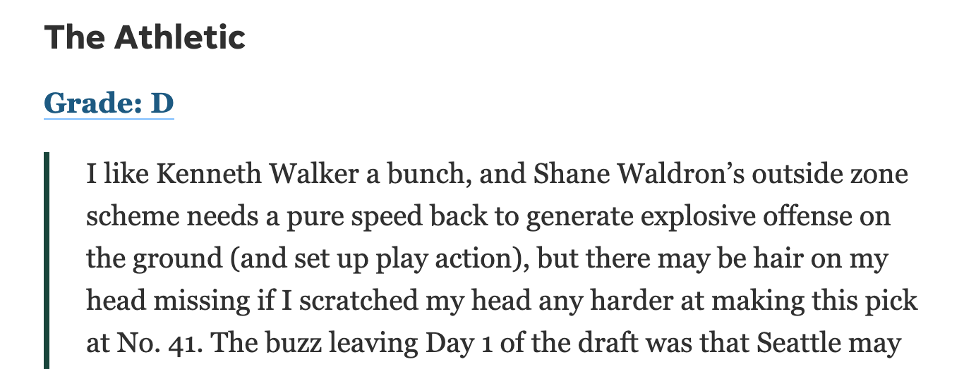 Personally, I like writers at The New York Times who a) watched the NFL for the last four years and know that Justin Fields is a great quarterback and b) lack such awareness of Jaxon Smith-Njigba’s potential that he won’t mention Seattle having him but will mention that the team parted with DK Metcalf and Tyler Lockett.