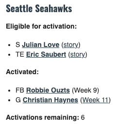 My understanding is that you can put players on IR throughout the season and then you basically declare your 8 activations as they happen, so right now the Seahawks have 2 players on IR who are eligible to be activated — Julian Love and Eric Saubert — and 2 players who have already been activated, Robbie Ouzts and Christian Haynes.