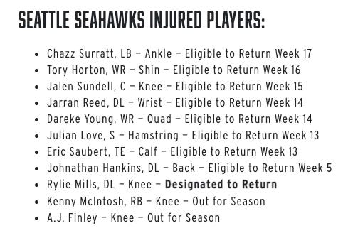 The Seahawks could designate two players to return from injured reserve next week, if not three or four, including starter Julian Love, key rotational pieces Jarran Reed and Eric Saubert, and special teams STAR Dareke Young. Love and Saubert were eligible to be activated this week but Mike Macdonald said that neither is ready, whereas Reed and Young are eligible to return from missing four games next week against the Falcons.