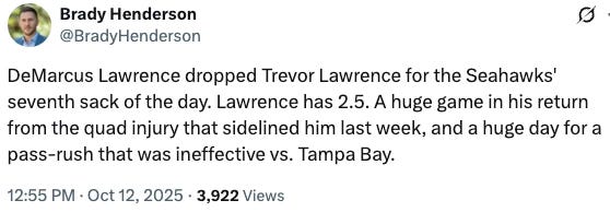 Albeit not a perfect outing, Darnold found Jaxon Smith-Njigba eight times for 162 yards and a touchdown, threw a perfect pass to Cooper Kupp for his second score, and clinched the game with a 61-yard play action bomb across his body to A.J. Barner. The Seahawks beat the Jaguars 20-12 and improved to 4-2, escaping another game with shaky coverage by Seattle’s secondary to win Mike Macdonald’s ninth straight road game.