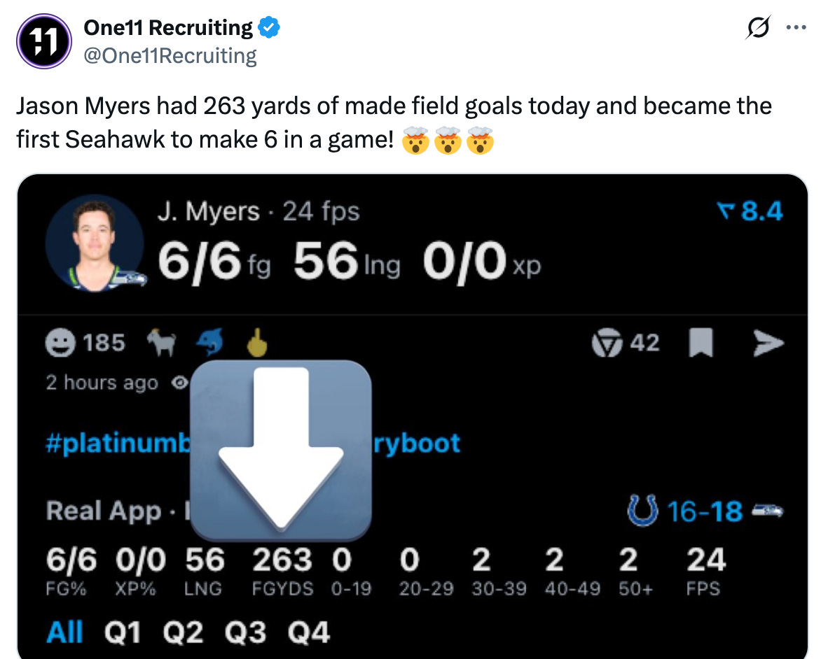 The Seahawks offense looked abysmal against the Colts on Sunday, but Myers came through by going a franchise record 6-of-6 on field goal attempts, including a 56-yard game-winner to seal the 18-16 victory over Indianapolis and the best performance of his career. Seattle is now 11-3 and they know that this Thursday’s game against the Rams is for control of the NFC West and the conference playoff picture.
