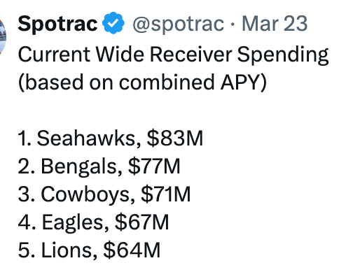 The Seahawks are spending an average of $83 million per season of annual average value on their wide receiver corps, more than any other team: