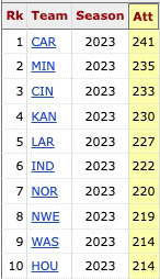 I looked to find out which teams had the most passing attempts through six games in 2023 and the answers: