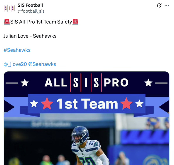 Love’s 22 passes defensed with Seattle is tied with Xavier McKinney for the third-most among safeties. Sports Info Solutions went outside the box by naming Love a first-team All-Pro safety for the 2024 season: