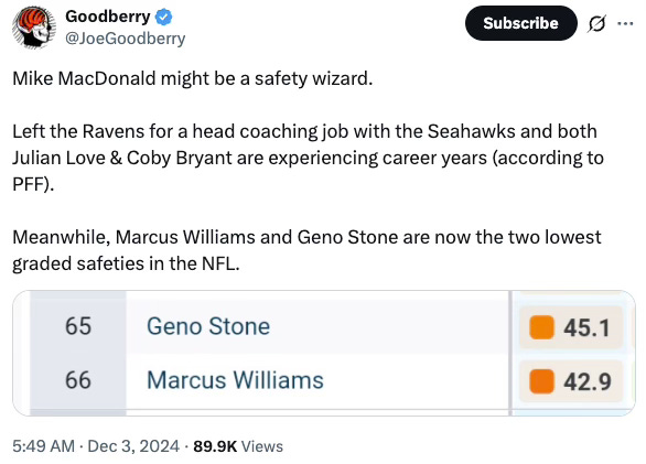 The main takeaway from that stat though is not necessarily to blame Seattle’s best safety (if not best deep player period) but to expect Mike Macdonald’s defense to be far stingier as a unit in 2025.